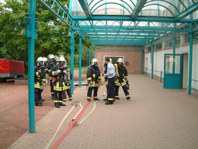 Grosse Teile des Schulgebäudes wurden mit Disko-Nebelmaschinen verqualmt, um den Einsatzkräften ein realistisches Übungsszenario zu bieten. Ganz wie im realen Einsatz mussten systematisch alle Klassenräume nach Personen abgesucht werden. Stellenweise war der Rauch so dicht, dass die Feuerwehrmänner sich nur noch schemenhaft an den Reflektoren der Einsatzkleidung erkennen konnten.