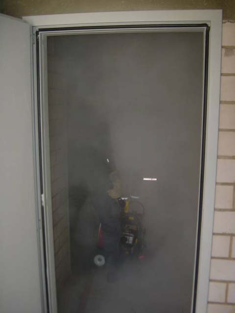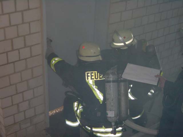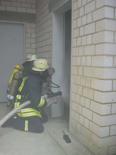 Am Vormittag stand die Brandbekämpfung auf dem Lehrplan. Dazu wurde das Trümmerhaus auf dem Schulgelände mit Nebelmaschinen verqualmt, um eine realistische Übungssituation zu bieten. Besonders beeindruckend war vor allem für die jüngeren Kameraden das Vorgehen mit "Wasser am Rohr" im Innenangriff, dass sich sonst in "trockenen" Übungen nur schwer darstellen lässt. Auch das richtige Niederschlagen von Rauchgasen beim Öffnen der Zimmertür konnte geübt werden.