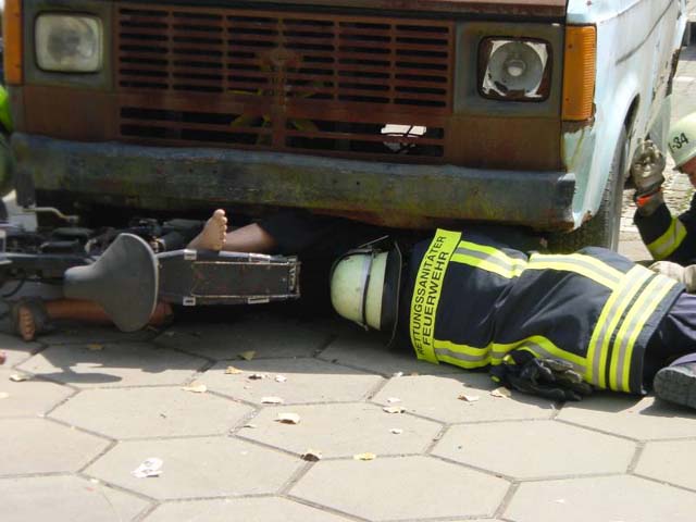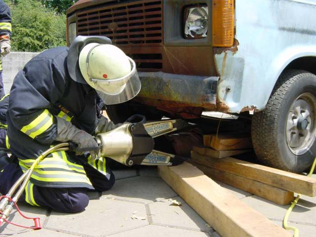 Nach einer Pause und frisch gestärkt durch das Mittagessen, dass unsere Küchentruppe zubereitete, ging es weiter mit dem Part "Technische Hilfe". Eine Person war nach einem Unfall unter einem PKW eingeklemmt. Sie musste so schonend wie möglich, eben "Patientengerecht" gerettet werden. Hier wurden verschiedene Vorgehensweisen probiert, etwa die Verwendung von pneumatischen Hebekissen oder der Einsatz von hydraulischem Werkzeug wie Stockwinde oder Spreizer.