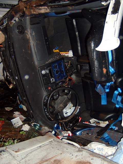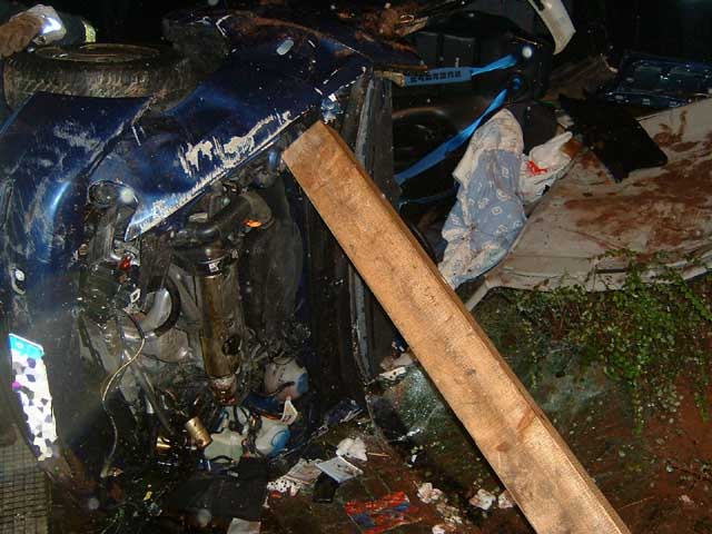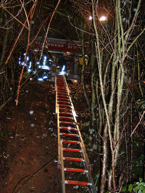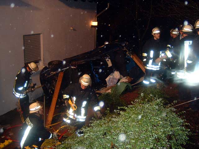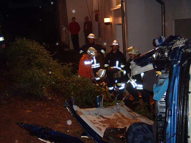 Ein mit zwei Personen besetzter Kleinwagen kam aus bis jetzt ungeklärter Ursache auf regennasser Fahrbahn von der Straße ab und stürzte in eine neben der Strasse verlaufende acht Meter tiefe Böschung. Erst nach gut 20 Metern und mehreren Überschlägen wurde der Flug schließlich durch eine Hauswand gestoppt. Das Fahrzeug blieb auf der Seite liegen.