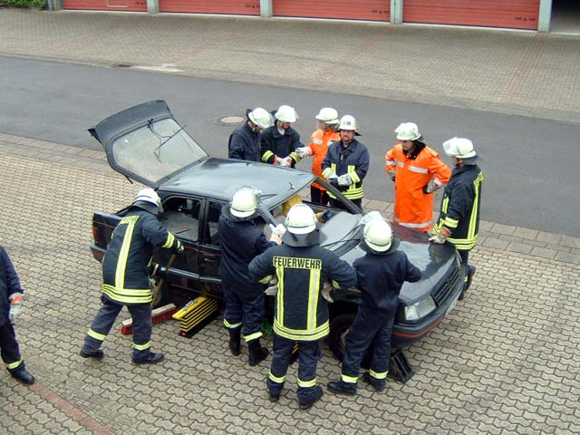 Sehr viel Engagement bei ihrer Ausbildung zeigten die neun in den letzten beiden Jahren von der Jugendfeuerwehr in den aktiven Einsatzdienst übernommenen Jugendlichen am letzten Samstag, den 19. Juni 2004. Gut drei Stunden lang übten sie das richtige Vorgehen bei der patientengerechten Rettung nach Verkehrsunfällen in der Praxis. Der Umgang mit den Geräten zur technischen Rettung erfordert eine gründliche Ausbildung und regelmäßige Übung. Da während ihrer Grundausbildung dieser Themenblock nur angeschnitten werden konnte, wurde nun auf eigenen Wunsch diese Sonderübung angesetzt. Angeleitet von erfahrenen Kameraden wurden ihnen die Grundsätze der patientengerechten Rettung vermittelt. Dabei geht es darum, eingeschlossene oder eingeklemmte Fahrzeuginsassen in Zusammenarbeit mit dem Rettungsdienst möglichst schonen aus ihrer misslichen Lage zu befreien. An einem ausrangierten Fahrzeug konnte dann mit den hydraulischen Rettungsgeräten in der Praxis gearbeitet werden. Das Stabilisieren des Fahrzeugs und die Entfernung der Scheiben wurde dabei ebenso geübt wie das Abtrennen des Fahrzeugdaches. Die Jugendlichen waren mit sehr viel Begeisterung bei der Sache. Auch wenn in dieser Übung nur Grundlagen vermittelt werden konnten, bilden sie die Basis für jede Tätigkeit bei realen Verkehrsunfällen. Das Ausbilderteam bedankt sich bei den "Jungen Aktiven" für das gezeigte Interesse, das über das geforderte Maß hinausgeht und steht ihnen gerne für weitere solcher Veranstaltungen als Ausbilder bereit.