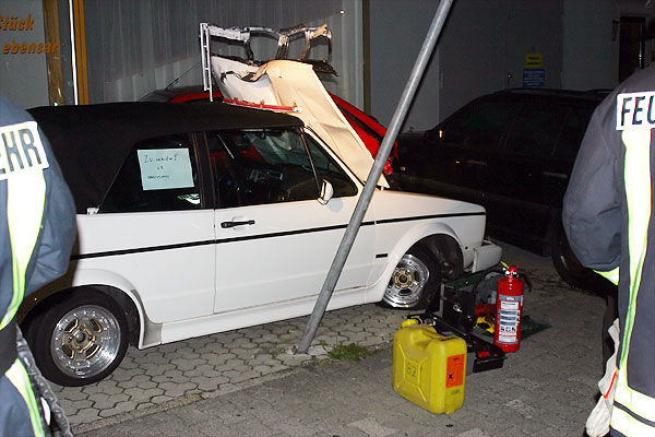 Ein PKW-Fahrer befuhr in der Nacht zum 23. Juli 2005 die Jägerbergstraße aus Richtung Mangelhausen und verlor in Höhe der Kirchenstraße die Kontrolle über sein Fahrzeug. Er prallte auf zwei dort vor einem Geschäft geparkte Autos und beschädigte diese schwer. Wegen der starken Rauchentwicklung an einem der Fahrzeuge wurde die Feuerwehr des Löschbezirks Wiesbach mit dem Stichwort "PKW-Brand" gegen 2.50 Uhr zur Einsatzstelle gerufen. Der Rauch kam von Kühlflüssigkeit, die auf heissen Motorteilen verdampfte, so dass keine Löscharbeiten erforderlich waren. Die Einsatzkräfte klemmten die Fahrzeugbatterie ab und nahmen auslaufende Betriebsstoffe mit Bindemitteln auf. Der Fahrer blieb bei dem Unfall unverletzt. An allen drei Fahrzeugen entstand erheblicher Sachschaden.