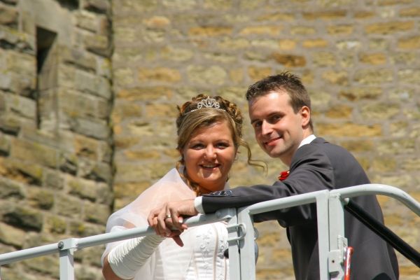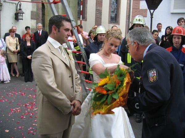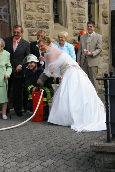 Um 14.00 Uhr war das Brautamt von Kamerad Frank Recktenwald und seiner Annika in der Pfarrkirche St. Mauritius in Sotzweiler und um 15.30 Uhr die kirchliche Trauung von Kamerad Andre Schwan und seiner Nicole in St. Sebastian in Eppelborn. Nach den Trauungen wurden die Frischvermählten bereits vor den Kirchen erwartet. Feuerwehrkameradinnen und –kameraden standen Spalier, als die Brautpaare durch das Kirchenportal traten. Sowohl Annika und Frank als auch Nicole und Andre mussten ihre Feuerwehrtauglichkeit unter Beweis stellen. Es galt u.a. eine Gasflamme mit der Kübelspritze zu löschen. Dabei wurde wieder einmal deutlich, das die Frauen eine glücklichere Hand hatten und das Feuer wesentlich schneller gebändigt bekamen. Nach einer Fahrt in den (siebten ?) Himmel mit der Lebacher Drehleiter gratulierte Löschbezirksführer Felix Becker beiden Paaren stellvertretend für alle Kameraden und Kameradinnen des Löschbezirks.