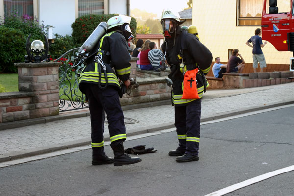 Im Anschluß an die Manöverkritik nach der Übung hatten alle dann die Gelegenheit, sich von den Illinger Kameraden die Einsatzmöglichkeiten der Drehleiter im Detail erkären zu lassen. Gerade im Löschbezirk Wiesbach kam dieses Rettungsgerät bei Einsätzen in den letzten Jahren vermehrt zum Einsatz. So war diese Übung nicht nur für die Anwohner der Grubenstraße eine spannende Sache…