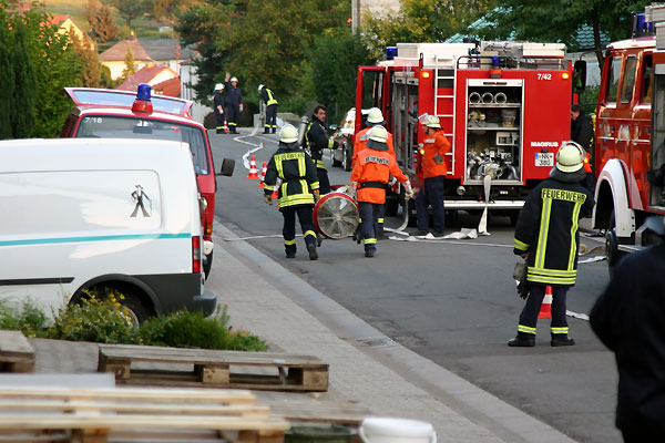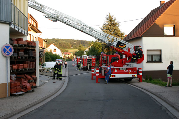 "Wo bleibt denn die Feuerwehr?", wollen die Kinder in der Wiesbacher Grubenstraße immer wieder von ihren Eltern wissen. Doch kein Feuer oder Rauch ist irgendwo zu bemerken. Was viele Anwohner am Abend des 30. August 2005 auf die Straße gerufen hat, ist eine angekündigte Übung des Löschbezirks Wiesbach zusammen mit der Drehleiter aus Illingen.
