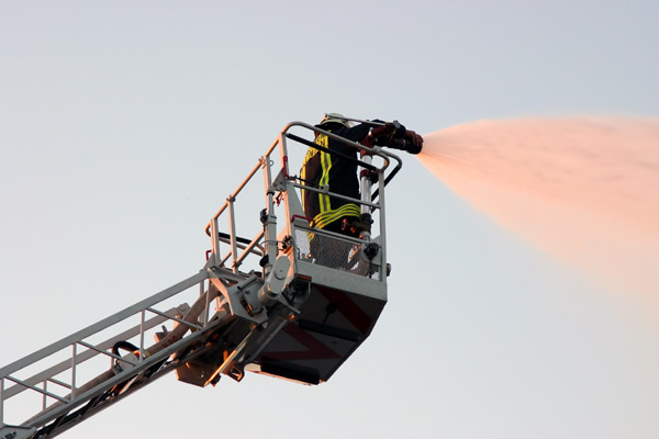 Einsatzleiter Peter Kiefer hatte diese Übung vorbereitet, um seinen Feuerwehrleuten die Besonderheiten und Einsatzmöglichkeiten beim Einsatz der Drehleiter zu vermitteln. Das beginnt schon beim Aufstellen der Einsatzfahrzeuge: Eine Drehleiter braucht einen festen Standplatz und Raum, um die seitlichen Stützen auszufahren. Auch Stromleitungen über der Straße können die Arbeiten behindern. Trotz allem muß immer noch genügend Platz bleiben, um das An- und Abfahren von Rettungsfahrzeugen zu gewährleisten.