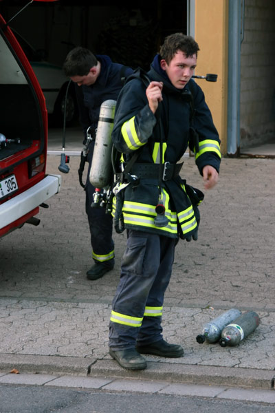 Angenommen war ein Brand in den Räumen der Firma Gabler. Unter dem Einsatz von Atemschutzgeräten gehen mehrere Trupps in das Gebäude, um nach den vier vermissten Personen zu suchen. Gleichzeitig wird vor dem Gebäude die Drehleiter in Stellung gebracht, um über den Balkon im ersten Stockwerk in das Gebäude vorzudringen.