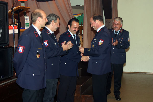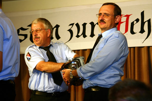 Dass Feuerwehrmänner immer bereit sein müssen, erlebten die Gäste beim Familienabend des Löschbezirks Eppelborn am 24. September 2005 hautnah. Kurz vor Beginn der Veranstaltung im Gasthaus Bohlen in Bubach-Calmesweiler piepten die Funkmeldeempfänger, und einige Kameraden mussten die Ausgeh- mit der Einsatzuniform tauschen. Sie unterstützten ihre Kameraden des Löschbezirks Dirmingen dabei, die Wasserversorgung zu einer abseits gelegenen Jagdhütte aufzubauen. Doch für allen anderen begann der Familienabend wie geplant mit der musikalischen Eröffnung durch den Fanfarenzug. In einer kurzen Ansprache dankte Löschbezirksführer Felix Becker den Feuerwehrmännern für die vielen Stunden ehrenamtlicher Arbeit. Und auch Bürgermeister Lutz sprach den Feuerwehrmännern und -frauen seinen Dank aus. Er nutzte die Gelegenheit, um Ehrungen für langverdiente Feuerwehrmitglieder auszusprechen. Markus Leidinger, Reinhard Fuchs erhielten eine Auszeichnung für 20 Jahre aktiven Dienst, Stefan Holz für 25 Jahre und Günter Hoffmann, Arnold Laub, Peter Saar, Michael Egler und Günter Klesen sogar für 35 Jahre. Wehrführer Recktenwald, der durch den Einsatz verspätet kam, erinnerte an die vielen Stunden, die die Feuerwehrmänner und -frauen auch im vergangenen Jahr wieder für den ehrenamtlichen Dienst aufbrachten. Ganz besonders dankte er den Ehefrauen und Partnerinnen der Wehrmänner, die viele Opfer für das Engagement ihrer Männer aufbringen müssen. Fanfarenzugführer Jörg Olliger zeichnete Peter Saar für seine 35-jährige Mitgliedschaft im Musikzug der Feuerwehr aus. Carlo Trenz und Reinhard Fuchs erhielten für 30 beziehungsweise 20 Jahre Zugehörigkeit die offizielle Auszeichnung der Bundesvereinigung Deutscher Musikverbände. Dann folgte der gemütliche Teil des Abends. Eine Tombola mit vielen Preisen wartete auf die Anwesenden, und gestärkt vom guten Essen wurde bis spät in die Nacht mit musikalischer Begleitung des Starlight Duo gefeiert und getanzt.