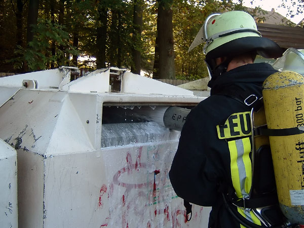 Auch hier brannten zwei gefüllte Papiercontainer und mussten von der Feuerwehr geflutet und mit Schaum abgelöscht werden. Sie wurden von ihren Kollegen unterstützt, die inzwischen den ersten Einsatz beendet hatten. Wegen der starken Rauchentwicklung musste die Arbeiten teilweise unter umluftunabhängigem Atemschutz durchgeführt werden.