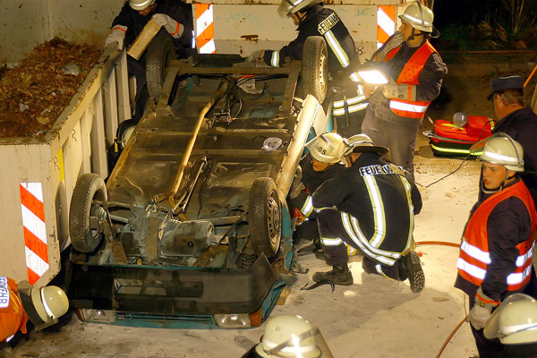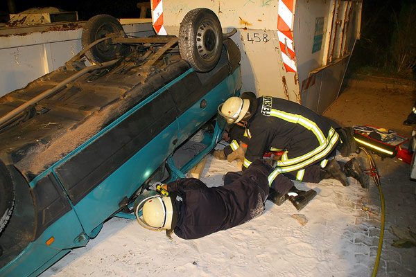Ein Unfallfahrzeug zu öffnen, das noch auf allen Rädern steht, wird oft und regelmäßig trainiert. Doch was tun, wenn die Insassen nach einem Unfall in einer denkbar ungünstigen Lage eingeschlossen sind? Das war das Übungsthema am Abend des 18. Oktober 2005 in Eppelborn. Ein Auto wurde auf dem Dach liegend zwischen mehreren Containern eingeklemmt, so dass der Zugang nur von einer Seite aus möglich war. "Retten der drei Insassen aus dem eingeschlossenen Fahrzeug" war jetzt Aufgabe der Einsatzkräfte.