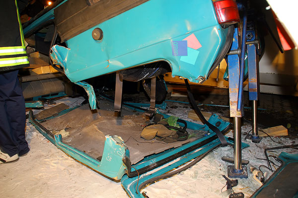 Die große Schwierigkeit bei diesem Übungsszenario war nun, dass durch die Lage des Fahrzeugs auf dem Dach ein Entfernen des Fahrzeugdachs und die anschließende Rettung nach oben nicht möglich war. Also musste ein Weg gefunden werden, trotzdem so viel Platz wie möglich im Innenraum zu schaffen. Dazu wurde das Fahrzeug zuerst mit Holzbohlen unterbaut, bis das Gewicht komplett vom Fahrzeugdach genommen war. Das Fahrzeugdach wurde jetzt abgetrennt und die gesamte Karosserie mit hydraulischen Stockwinden angehoben. Durch den jetzt geschaffenen Freiraum konnten alle Insassen gerettet werden.
