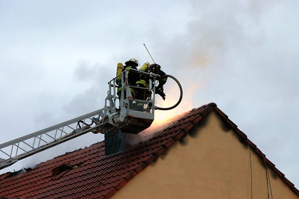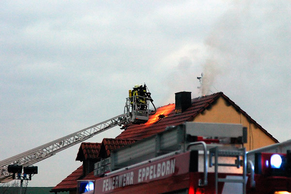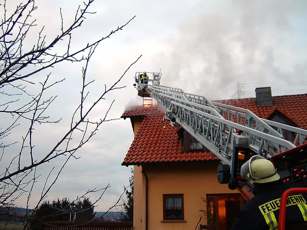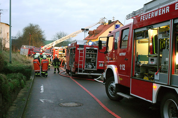 Der Eigentümer eines Einfamilienhauses in der Wiesbacher Straße "Zum Eschwald" bemerkte am Nachmittag des 03. Januar 2006 einen Brand im Obergeschoss seines Anwesens und alarmierte umgehend die Feuerwehr. Die Männer und Frauen des Löschbezirks Wiesbach, die gegen 15.38 Uhr über Funkmeldeempfänger alarmiert wurden, trafen kurz darauf an der Einsatzstelle ein. Da zu Beginn davon ausgegangen werden musste, dass noch eine Person im Haus vermisst wird, wurde Großalarm für die Feuerwehr ausgelöst. Zusätzlich zu den Einsatzkräften aus Wiesbach wurden Einheiten aus Eppelborn und Habach alarmiert. Unterstützung kam auch aus Illingen: Mit Drehleiter und Einsatzleitwagen rückten Einsatzkräfte aus der Nachbargemeinde zum Einsatzort aus. Zusätzlich machten sich ein Notarztfahrzeug sowie ein Rettungswagen von den Rettungswachen in Illingen und Lebach auf den Weg nach Wiesbach. [left][cmsimg]784[/cmsimg][/left]Beim Eintreffen der ersten Kräfte schlugen die Flammen bereits über die gesamte Firstlänge aus dem Dach. Der Aufenthaltsort eines Familienmitglieds war zu diesem Zeitpunkt nicht bekannt, so dass davon ausgegangen werden musste, dass er sich noch in dem Gebäude befindet. Umgehend gingen die ersten Einsatzkräfte, ausgerüstet mit Atemschutzgeräten zur Menschenrettung in das stark verqualmte Obergeschoss vor. Mit einem Überdrucklüfter, der vor der Eingangstür in Stellung gebracht wurde, konnte der Weg der Trupps im Inneren des Gebäudes rauchfrei geblasen werden, so dass das Durchsuchen der Zimmer wesentlich zügiger vonstatten ging. Da das Gebäude über einen Dachanschluss mit Strom versorgt wurde, mussten die Zuleitungen zur Sicherheit vom Energieversorgungsunternehmen gekappt werden. Noch während der Suche erschien die vermisste Person wohlbehalten an der Einsatzstelle, so dass sich die Einsatzkräfte jetzt ganz auf die Brandbekämpfung konzentrieren konnten. Während der Brand im Obergeschoss schnell gelöscht werden konnte, musste zur Bekämpfung der Flammen im Dachboden erst von der Drehleiter aus die Dachhaut geöffnet werden. Mit der Wärmebildkamera aus Illingen konnten auch versteckte Brandnester schnell gefunden und abgelöscht werden. Gegen 17.00 Uhr konnte dann "Feuer aus" gemeldet werden. Die Nachlöscharbeiten zogen sich noch bis gegen 19.00 Uhr hin. [right][cmsimg]788[/cmsimg][/right]Der Brand brach nach ersten Erkenntnissen im Bereich mehrerer Elektrogeräte im ersten Obergeschoss des Hauses aus. Die Brandermittler der Kriminalpolizei haben die Ermittlungen zur genauen Brandursache aufgenommen. An dem Einfamilienhaus entstand erheblicher Sachschaden, die genaue Schadenshöhe steht bislang noch nicht fest. Verletzt wurde beim dem Einsatz glücklicherweise niemand. Wehrführer Hermann Josef Recktenwald, der die Einsatzleitung hatte, dankte den Einsatzkräften in einer kurzen Nachbesprechung im Wiesbacher Gerätehaus für die geleistete Arbeit. "Die gemeinsamen Übungen in den letzten Jahren zeigen Wirkung", lobte er die einwandfreie Zusammenarbeit der Löschbezirke.