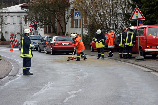 Schon wieder erforderte eine längere Ölspur, die sich durch die Orte Habach und Wiesbach zog, den Einsatz der Feuerwehr. Der Fahrer eines PKW hatte nicht bemerkt, dass sein Fahrzeug offenbar durch einen technischen Defekt Dieselkraftstoff oder Öl verlor und so auf seiner Einkaufsfahrt am 25. März 2006 von der Habacher Großwaldstraße bis nach Wiesbach und wieder zurück die Ölspur verursacht. Gegen kurz vor zwölf wurde der Löschbezirk Wiesbach über Funkmeldeempfänger alarmiert. Um den Ausgangspunkt der Spur ausfindig zu machen, fuhren die Einsatzkräfte die Hauptstraße in Richtung Habach ab. Beim Rückweg aus Richtung Habach dann die große Überraschung: Wo eben noch auf der Gegenfahrbahn keine Ölspur war, waren dort jetzt plötzlich auch große, buntschillernde Flecken zu sehen. Einsatzkräfte des Löschbezirks Habach, die gerade auf der Rückfahrt von einer Umweltsäuberungsaktion waren, unterstützen ihre Kameraden und übernahmen die Beseitigung der Ölspur vom Ortseingang Habach bis zur Großwaldstraße. Mit Ölbindemittel wurde die Straße gereinigt und das ausgelaufene Öl aufgenommen. Der Einsatz war nach gut zwei Stunden beendet. Vor Ort im Einsatz war auch Kräfte der Polizei, die den Verursacher ausfindig machen konnte.