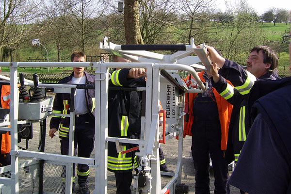 Gemeinsam mit den Kameraden der Feuerwehr Illingen hatten die Männer und Frauen der Löschbezirke Hierscheid und Humes am 22. April 2006 Gelegenheit, in einer interessanten Übung die Illinger Drehleiter kennenzulernen.