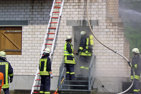 "Gebäudebrand, es werden noch Personen im Gebäude vermisst!", so die Ausgangslage für den Einsatzleiter. Während sich Feuerwehrmänner mit Atemschutzgeräten ausrüsten, bauen anderen die Wasserversorgung auf und bringen eine Leiter in Stellung. Unter Atemschutz tasten sich die Feuerwehrleute immer weiter in den dichten Rauch vor, bis die vermisste Person gefunden ist und gerettet werden kann.