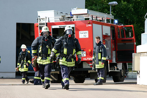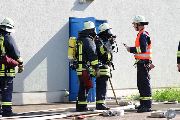 Die Frauen und Männer aus den Löschbezirken Bubach-Calmesweiler und Eppelborn bauten die Löschwasserversorgung aus der in unmittelbarer Nähe fließenden Ill auf und begannen mit dem Löschangriff. Gleichzeitig rüsteten sich weitere Kräfte mit Atemschutzgeräte aus, um die vermissten Arbeiter zu suchen und zu retten. Vor allem der Einsatz mit Atemschutzgeräten bedeutete bei den sommerlichen Temperaturen eine große Belastung. Trotzdem wurden die Übungspuppen in kürzester gefunden und ins Freie gebracht.