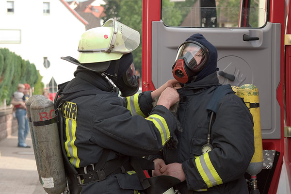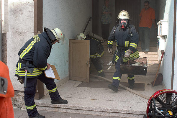 Aus einem Kellerraum eines beidseitig angebauten, zweigeschossigen Gebäudes in der Hauptstraße drang dichter Rauch. Die Einsatzkräfte, die bereits kurz nach der Alarmierung vor Ort eintrafen, rüsteten sich mit Atemschutzgeräten aus und drangen mit einem Schlauch ausgerüstet in die von aussen zugänglichen Kellerräume vor.