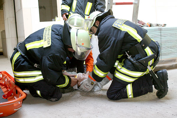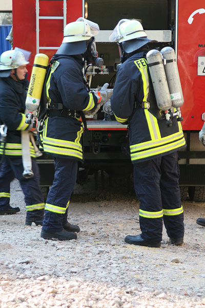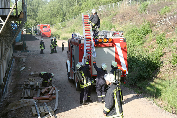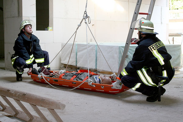 Bei Schweißarbeiten, so die Übungsvorgabe bei dieser unangekündigten Alarmübung, kam es in dem im Rohbau befindlichen Erweiterungsbaus zu einem Brand von Isoliermaterial. Den dort tätigen Arbeitern gelang es mit eigenen Mitteln nicht mehr, ein Übergreifen des Feuers auf weiteres brennbares Material zu verhindern. Sie erlitten durch die giftigen Dämpfe eine Rauchvergiftung und brechen bewusstlos zusammen, noch ehe sie sich ins Freie retten können. Als er seinen Kollegen zu Hilfe kommen will, stürzt ein weiterer Arbeiter in einen Deckenschacht und bleibt ebenfalls bewusstlos liegen. Gegen 18.30 Uhr werden nacheinander die Löschbezirke Habach, Wiesbach und Eppelborn zur Unglücksstelle alarmiert. Als erstes konzentrieren sich die Einsatzkräfte auf die Brandbekämpfung sowie die Rettung der beiden bewusstlosen Arbeiter. Ausgerüstet mit Atemschutzgeräten dringen die Feuerwehrleute in das Gebäude vor und können beide Verletzte ins Freie retten. Da die Wasserversorgung aus dem Hydranten nicht ausreicht, muss eine Schlauchleitung über mehrere hundert Meter vom Löschteich bis zur Einsatzstelle verlegt werden. Gemeinsam und durch den Einsatz von mehreren Rohren gelingt es der Feuerwehr, ein weiteres Ausbreiten des Brandes zu verhindern. Problematisch ist die Rettung des abgestürtzen Arbeiters. Ein Zugang ist nur durch den Deckenschacht über das Dach des Neubaus möglich. Über Leitern dringen die Einsatzkräfte zu dem Verletzten vor, unter ihnen auch ausgebildete Rettungssanitäter der Feuerwehr, die eine medizinische Erstversorgung durchführen. Nachdem der Patient stabilisiert ist, kann die Rettung eingeleitet werden. Mit einer Korbtrage wird er zuerst auf das Dach verbracht und kann von dort gerettet werden. Einsatzleiter und Löschbezirksführer des Löschbezirks Habach Engelbert Ruschel war sehr zufrieden mit der gezeigten Leistung. Die Einsatzkräfte aus den drei Löschbezirken Wiesbach, Habach und Eppelborn arbeiteten Hand in Hand, um die gestellten Aufgaben zu bewältigen. Das Pflegeheim in Habach mit seinen über 200 Bewohnern mit psychischen Behinderungen stellt im Einsatzfall eine besondere Herausforderung für die Feuerwehr dar. Nicht nur durch den weitläufigen Gebäudekomplex, sondern vor allem durch die besondere Betreuungsbedürftigkeit der Bewohner ist ein Einsatz aufwändig und personalintensiv. Regelmäßige Übungen an diesem Objekt dienen auch dazu, den Bewohnern die Angst vor der Feuerwehr zu nehmen. Zudem finden in regelmäßigen Abständen durch die Feuerwehr Brandschutzschulungen für die Pflegekräfte statt.