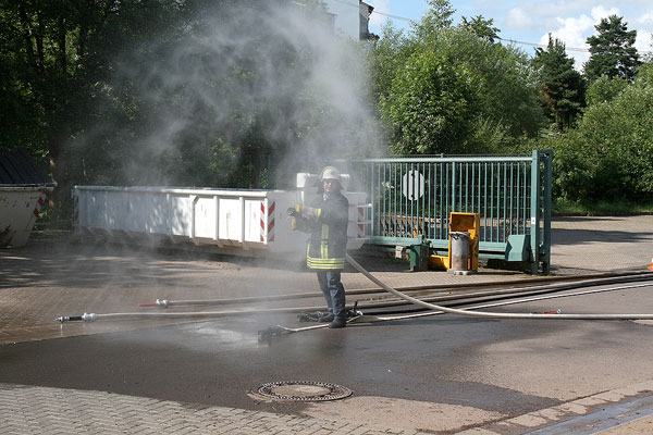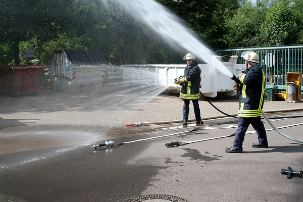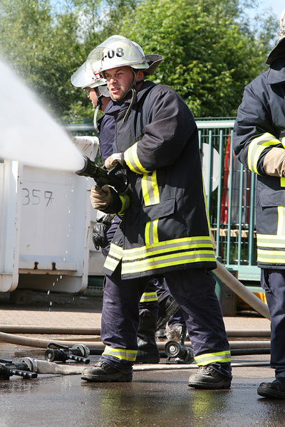 Heiß diskutiert war im Vorfeld besonders der Einsatz des Schnellangriffsschlauches im Innenangriff. Noch vor Jahren das Mittel der Wahl, haben sich durch ihn inzwischen bundesweit tragische Unfälle ereignet. Denn dieser Schlauch bringt durch seinen geringeren Durchmesser als ein Standard-C-Löschschlauch in Verbindung mit einem Hohlstrahlrohr nicht die erforderliche Wassermenge zum Brandherd, um eine feine Zerstäubung des Wassers zu ermöglichen. Doch die ist nötig, um die heissen Brandgase herunterzukühlen und den gefürchteten Flash-Over zu verhindern. Im direkten Vergleich war der Unterschied für die Anwesenden offensichtlich.