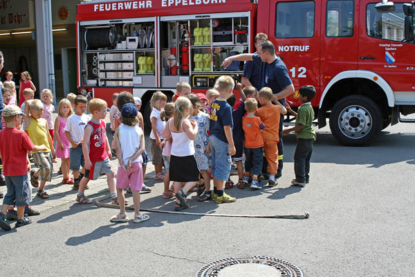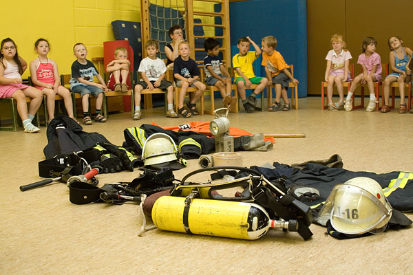 Den Auftakt machte ein Besuch von drei Feuerwehrnännern, darunter auch der Wehrführer Hermann Josef Recktenwald, im Kindergarten am 13. Juli. Sie hatten eine Menge Ausrüstungsgegenstände mitgebracht, die ein Feuerwehrmann bei seiner Arbeit braucht. Nachdem sie einen Feuerwehrmann komplett angezogen hatten, konnte sie auch selbst alles einmal anziehen und anfassen. Wehrfuehrer Recktenwald ging ganz besonders auf den Notruf ein und erklärte den Kindern, wie sie bei einem Notfall Hilfe rufen können.