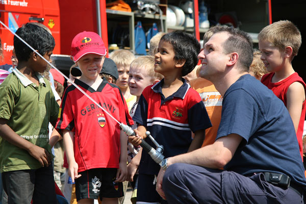 Am Tag darauf besuchten die Kinder die Feuerwehr im Feuerwehrgerätehaus in der Schleidstraße. Sie waren ganz überrascht, wie groß die Feuerwehrfahrzeuge in Wirklichkeit sind. Auch hier konnten sie viele Gerätschaften der Feuerwehr, die sie vorher nur aus den Bilderbüchern kannten, bestaunen und selbst einmal in die Hand nehmen. Zum Abschluss durfte dann jedes Kind auch einmal wie ein richtiger Feuerwehrmann mit dem Feuerwehrschlauch löschen.