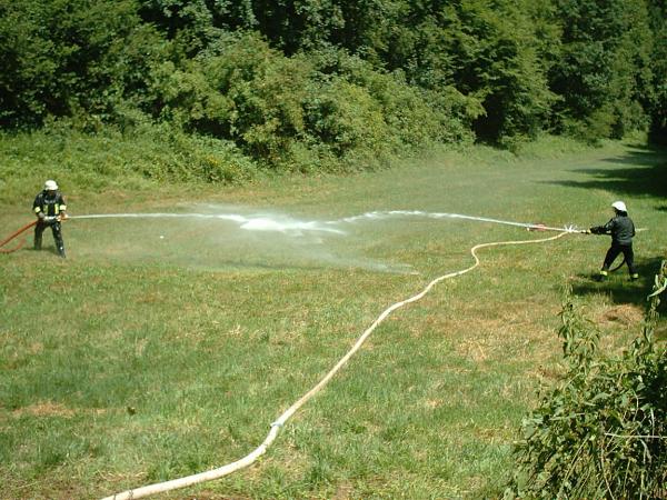 Bevor die Übung beendet wurde, hatte man die Gelegenheit genutzt sich noch einer kühlen C-Schlauch Dusche zu unterziehen, was allen sichtlich Freude bereitete. In der Nachbesprechung zur Waldbrandübung 2006 konnte festgestellt werden, dass das Übungsziel erreicht wurde und dass die Mannschaften sehr engagiert gearbeitet hatten.