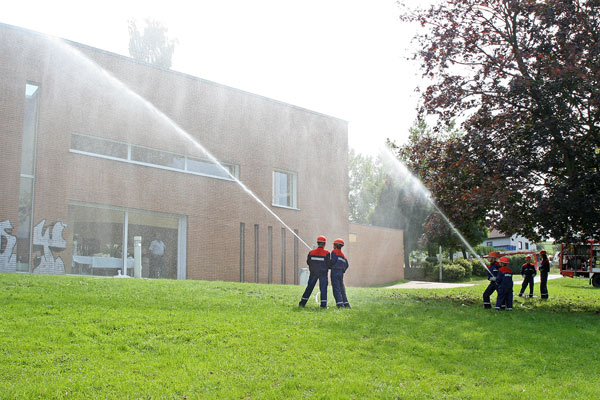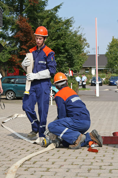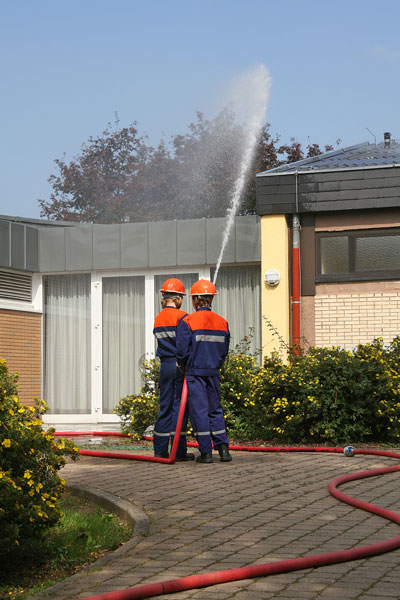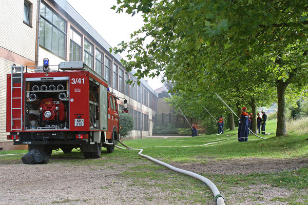 Durch einen technischen Defekt an einem Computer kommt es am Nachmittag des 10. Septembers 2006 zu einem Brand im PC-Raum der Grundschule in Bubach-Calmesweiler. Da die Räumlichkeiten am Wochenende verlassen sind, kann sich das Feuer ungehindert ausbreiten. Als Anwohner die Flammen und den Rauch bemerken, hat der Brand längst auf weitere Klassenräume übergegriffen. Als die ersten Jugendfeuerwehrleute des Löschbezirks Bubach-Calmesweiler am Feuerwehrgerätehaus eintreffen, drohen die Flammen bereits auf die Hirschberghalle sowie das in direkter Nachbarschaft stehende Feuerwehrhaus überzugreifen. Da offensichtlich ist, dass die eigenen Kräfte nicht ausreichen, werden Einsatzkräfte aus allen Ortsteilen der Gemeinde Eppelborn zur Unterstützung nachgefordert. Es ist ein schwieriges Szenario für die Jungen und Mädchen der Jugendfeuerwehr, das sich der Löschbezirk Bubach-Calmesweiler, der in diesem Jahr die Abschlussübung der Jugendfeuerwehr ausrichtet, ausgedacht hat. An gleich drei Einsatzstellen müssen die Jugendlichen aus allen Löschbezirken der Gemeinde den imaginären Brand löschen. Dazu muss Löschwasser aus Hydranten entnommen und mit Pumpen bis zu den Einsatzstellen gefördert werden. Schläuche werden ausgerollt und angeschlossen. Mit bis zu 20 Rohren kämpfen die Jugendfeuerwehrleute gegen die Flammen und schirmen die Nachbargebäude vor der Hitze ab. Gemeindejugendbetreuer Karl Paul war sichtlich zufrieden mit der Leistung des Feuerwehrnachwuchses. Und auch Bubachs Ortsvorsteher Werner Michels dankte den über 50 anwesenden Jugendfeuerwehrleuten für ihr Engagement. Nach getaner Arbeit wartete dann eine kleine Stärkung auf die Jungen und Mädchen. Die Abschlussübung ist der Höhepunkt der Jugendfeuerwehrausbildung in jedem Jahr. Hier kann der Feuerwehrnachwuchs das Wissen präsentieren, welches in Übungen und Ausbildung durch ihre Jugendbetreuer vermittelt wurde. Und auch die Zusammenarbeit der Löschbezirke untereinander wird durch solche gemeinsamen Übungen schon von Anfang an gefördert. Neben der feuerwehrtechnischen Ausbildung steht vor allem eine Menge Spaß auf dem Übungsplan. Ausflüge, Nachtwanderung und sportliche Wettkämpfe sorgen für Abwechslung. Mitmachen können Jungs und Mädchen ab 10 Jahren.