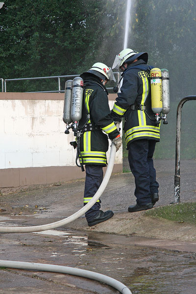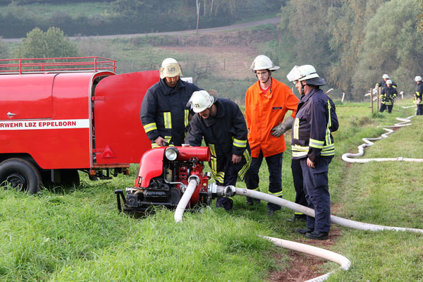 Zwar ist der auf dem Gelände vorhandene Hydrant für eine Leistung von 800 Litern Löschwasser pro Minute ausgelegt, doch das reicht für einen Brand in der angenommenen Größenordnung nicht aus. Deshalb bringen die Kameraden aus Bubach-Calmesweiler an einer Weiheranlage in rund 600 Metern Entfernung eine Pumpe in Stellung, mit der weitere 800 Liter in der Minuten zum Einsatzort gepumpt werden. Mit dem Schlauchwagen aus Eppelborn ist die Schlauchleitung in kürzester Zeit über einen Feldweg verlegt.