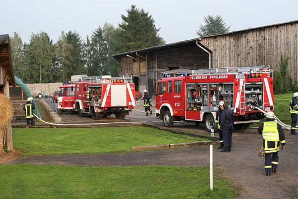 Durch einen technischen Defekt kam es zu einem Brand in der Reithalle des Pferdehofes, so die Ausgangslage der löschbezirksübergreifenden Übung. Als die ersten Einsatzkräfte eintreffen, hat sich das Feuer bereits ausgebreitet, der vordere Teil der Reithalle steht in Flammen. Neben der eigentlichen Brandbekämpfung und der Suche nach noch in der Halle vermissten Personen stellt besonders die Löschwasserversorgung eine besondere Herausforderung für die Übungsteilnehmer dar.