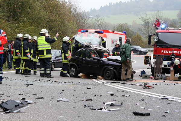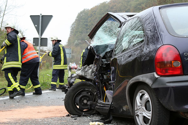 Gemeinsam mit Polizei und Rettungsdienst wird auch die Feuerwehr aus dem Löschbezirk Eppelborn gegen 12.15 Uhr mit dem Stichwort "Eingeklemmte Person" alarmiert. Für die kurz nach dem ersten Rettungswagen eintreffenden Einsatzkräfte bietet sich ein Bild der Zerstörung: Die Insassen des Mazda werden von Ersthelfern am Straßenrand betreut, in der Fahrbahnmitte steht der Opel Corsa mit der eingeklemmten Fahrerin entgegen der ursprünglichen Fahrtrichtung. Die Straße ist übersäht mit Trümmerteilen der beiden Fahrzeuge.