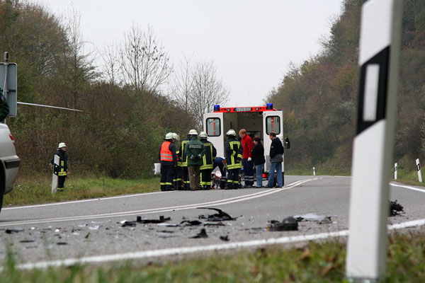 Gemeinsam mit dem inzwischen eingetroffenen Notarzt und Rettungsassistenten wird die eingeklemmte Fahrerin von Rettungssanitätern der Feuerwehr erstversorgt. Nach der Gabe von Schmerz- und Beruhigungsmitteln kann dann die Rettung der jungen Frau beginnen. Dazu müssen die Fahrertür sowie der vordere Teil des Wagendaches mit hydraulischen Rettungsgeräten entfernt werden. In enger Zusammenarbeit mit dem Notarzt des ebenfalls zur Unfallstelle entsandten Rettungshubschraubers gelingt es nach gut einer halben Stunde, die Fahrerin so schonend wie möglich zu befreien.