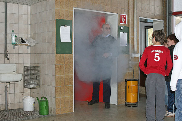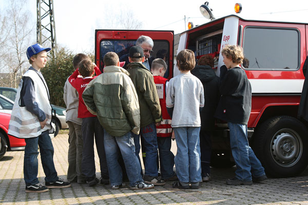 Mit Disconebel aus der Nebelmaschine wurde ein Zimmer wie bei einem Brand verraucht. Hier konnten die Kindern sehen, dass es ganz wichtig ist, Türen schnell zu schließen, damit sich der Brandrauch nicht ausbreiten kann. Anschließend kam das, worauf wohl die meisten der Schülerinnen und Schüler gewartet hatten: In der Fahrzeughalle konnte sie die Feuerwehrfahrzeuge und die vielen Geräte besichtigen und auch selbst einmal anfassen.