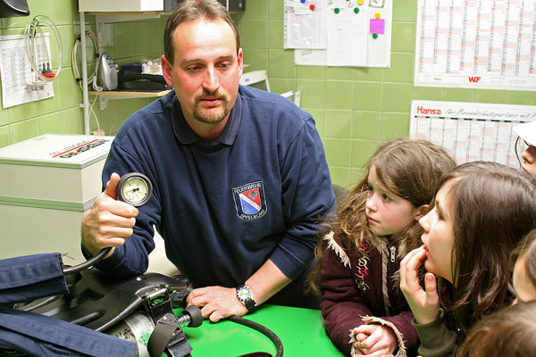 Im Lehrsaal der Feuerwehr erklärte Brandmeister Christian Holz den Grundschülern, wie man sich im Brandfall richtig verhalten muss, um nicht selbst in Gefahr zu geraten. Dabei waren die Schülerinnen und Schüler sehr gut vorbereitet: Auf viele Fragen der Feuerwehrmanns wussten sie die richtige Antwort. Spielerisch zeigte Holz dann, wie auch ein Kind über die Notrufnummer schnell Hilfe herbeiholen kann und welche Informationen die Feuerwehr braucht, damit sie schnell vor Ort sein kann.