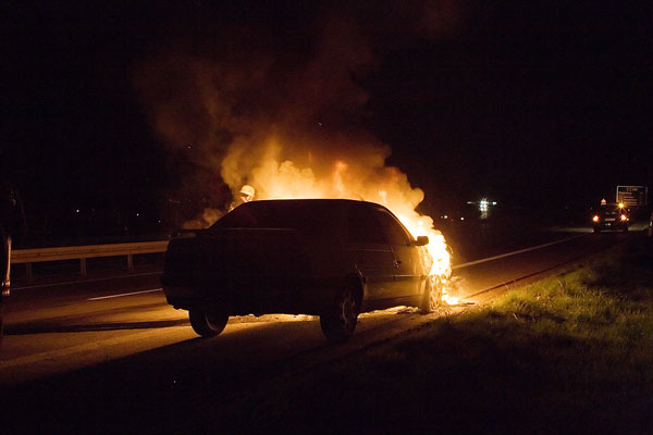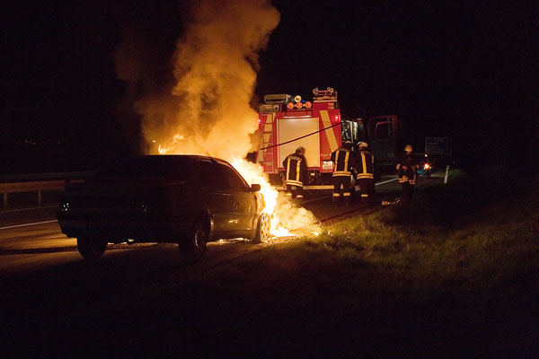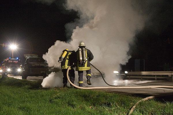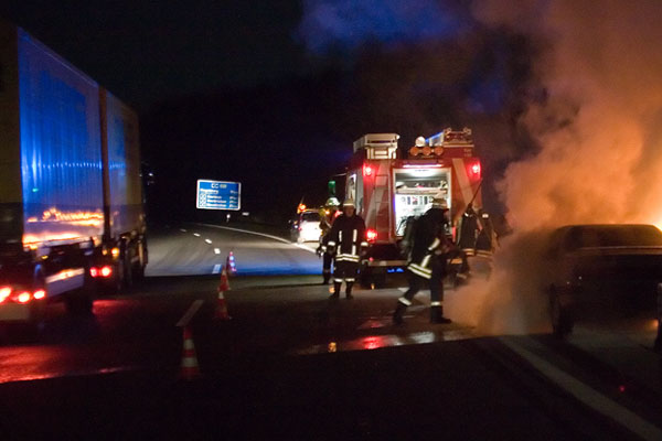 Der Fahrer eines Peugeot befuhr am Abend des 02. April 2007 mit seinem Fahrzeug die Autobahn A1 in Richtung Saarbrücken, als ihn ein überholender Fahrer auf starke Rauchentwicklung an seinem Fahrzeug aufmerksam machte. Er konnte das Fahrzeug gerade noch kurz hinter der Anschlussstelle Eppelborn auf dem Standstreifen zum Stehen bringen und den mitgeführten Anhänger abhängen, bevor der vordere Fahrzeugteil in hellen Flammen aufging. Noch während sich die Einsatzkräfte des um 21.00 Uhr alarmierten Löschbezirks Eppelborn auf der Anfahrt zur Einsatzstelle befanden, versuchten Beamte der Verkehrspolizei, die zufällig an der Unfallstelle eintrafen, den Brand mit einem Feuerlöscher unter Kontrolle zu bringen. Die Löschversuche blieben allerdings erfolglos. Beim Eintreffen der Feuerwehr stand der gesamte Motorraum des Wagens in Flammen. Mit Löschschaum gelang es den Einsatzkräften schnell, das Feuer unter Kontrolle zu bringen und das Fahrzeug zu löschen. Wegen der starken Rauchentwicklung mussten die Löscharbeiten mit Atemschutzgeräten durchgeführt werden. Während der Löscharbeiten musste eine Fahrspur der Autobahn gesperrt werden. An dem Fahrzeug enstand Totalschaden, der Fahrer blieb glücklicherweise unverletzt. Der Anhänger und das darauf befindliche Fahrzeug blieben unbeschädigt.