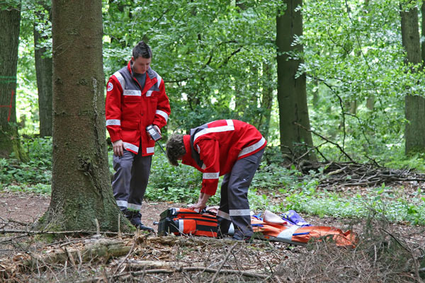 Eine Suchkette wurde gebildet und das angrenzende Waldstück Meter für Meter nach den noch vermissten Personen durchsucht. Gleichzeitig wurde die Grillhütte in einen provisorischen Verbandplatz verwandelt. Schnell sind die Jugendlichen gefunden und können nach einer Erstversorgung zum Verbandsplatz gebracht werden. Zum Teil müssen Einsatzkräfte der Feuerwehr mit der Motorsäge ran, um für eine schonende Rettung störende Äste zu beseitigen.