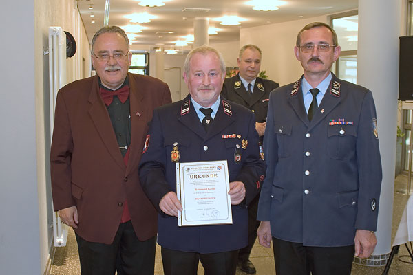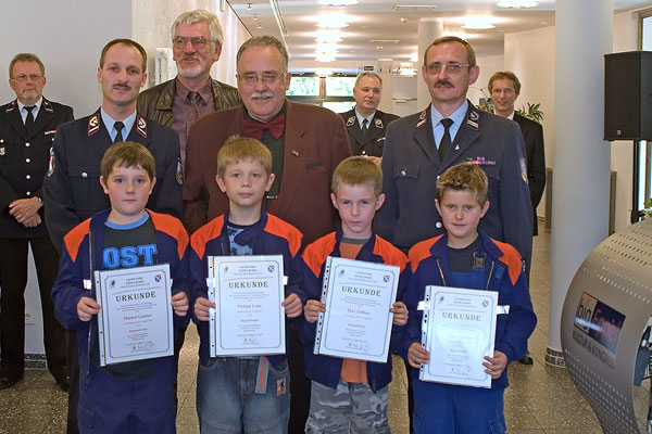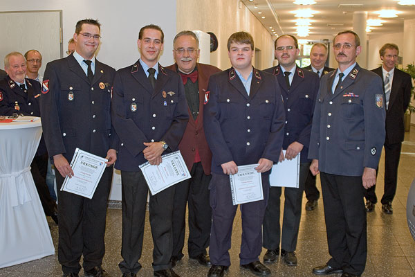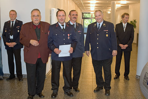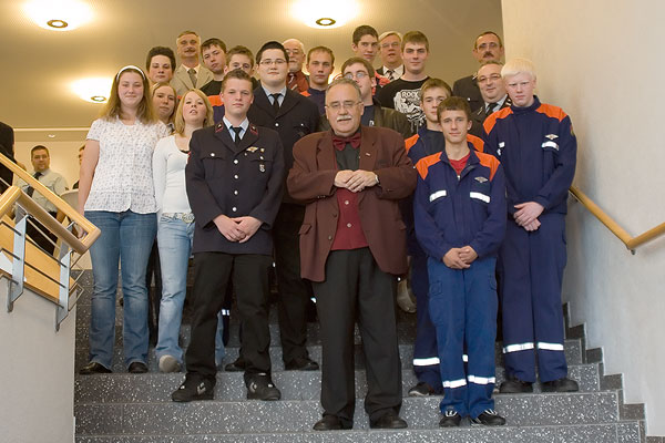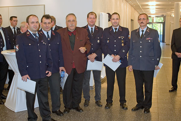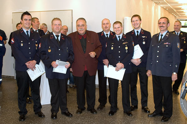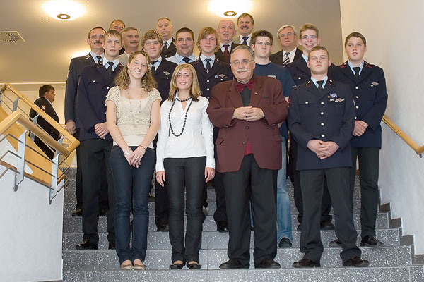Auf Bürgermeister Fritz-Hermann Lutz wartete eine große Aufgabe: Er hatte 72 Feuerwehrmänner und -frauen aus allen Löschbezirken der Gemeinde Eppelborn zu einem gemeinsamen Ehrungsabend am 14. September 2007 im Kulturzentrum "big Eppel" eingeladen, um gemeinsam mit Wehrführer Hermann Josef Recktenwald zahlreiche Ehrungen und Beförderungen auszusprechen. "72 Ehrungen und Beförderungen sind eine stolze Zahl", bemerkte der Bürgermeister in seiner Eröffnungsrede. Besonders die 20 Übernahmen in die aktive Einsatzabteilung freuten den Rathauschef, denn zur Zeit hat die Eppelborner Wehr im Gegensatz zu vielen anderen Feuerwehren noch keine Nachwuchsprobleme. Er konnte mit Timo Spaniol, MArius Gerber, Philipp Lenz und Max Zöllner gleich vier neue Mitglieder in die Jugendfeuerwehr des Löschbezirks Dirmingen aufnehmen. Wehrführer Recktenwald dankte den Feuerwehrangehörigen für ihren ehrenamtlichen Einsatz. "Schön, dass auch heute noch viele Menschen gibt, die bereits sind, sich für ein Ehrenamt zu engagieren", so Recktenwald in seiner Ansprache. Er dankte aber auch den beiden Feuerwehrsachbearbeitern Peter Leo und Alfred Wirtz für die sehr gute Zusammenarbeit im vergangenen Jahr. Gemeinsam nahmen Bürgermeister und Wehrführer dann die Übernahmen aus der Jugendfeuerwehr in die aktive Einsatzabteilung vor. 20 Jugendfeuerwehrleute wurden als Feuerwehrmann-Anwärter in die aktive Wehr aufgenommen und werden jetzt ihre Grundausbildung beginnen. Ganz besonders erfreulich: Mit Stefanie Kuhn, Katrhin Schorr und Marina Heinen – alle drei aus dem Löschbezirk Dirmingen – gehören weitere drei Frauen der Einsatzmannschaft der Feuerwehr Eppelborn an. Neben zahlreichen weiteren Beförderungen konnte Bürgermeister Fritz Hermann Lutz auch zwei besondere Auszeichnungen vergeben: Raimund Grohs wurde vom Oberlöschmeister zum Brandmeister, Christian Holz sogar vom Brandmeister zum Oberbrandmeister befördert. Für 20 Jahre aktive Mitglied wurden Michael Becker, Thorsten Fuchs, Guido Schwirz und Sascha Müller ausgezeichnet. Sie erhielten neben einer Urkunde auch die Ehrenuhr der Gemeinde Eppelborn. Auf eine 40-jährige Dienstzeit kann Werner Schwan aus Eppelborn zurückblicken, der sich aber entschuldigen lies. Die Ehrung wird zu einem späteren Zeitpunkt nachgeholt. Der Brandinspekteur des Landkreises Neunkirchen, Werner Thom, war ebenfalls zu der Veranstaltung gekommenund überbrachte im Namen des Landkreises Neunkirchen und des Landesbrandinspekteurs den Dank für die geleistete Arbeit. Er lobte in einer kurzen Rede ganz besonders die aktive Jugendarbeit in der Feuerwehr der Gemeinde, was ein Verdienst der sehr motivierten Jugendbetreuer sei, allen voran Gemeindejugendbetreuer Karl Paul. Thom zeichnete Joachim Naumann für 25 Jahre treue Dienste in der Feuerwehr aus, Bernd Backes, Helmut und Engelbert Ruschel und Albert Kiefer sogar für 35 Jahre.