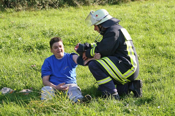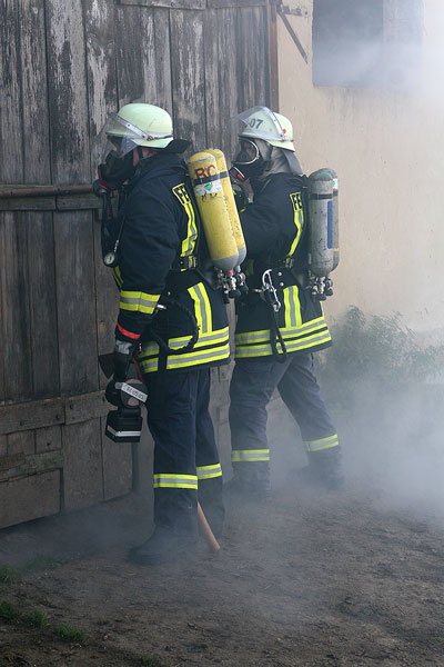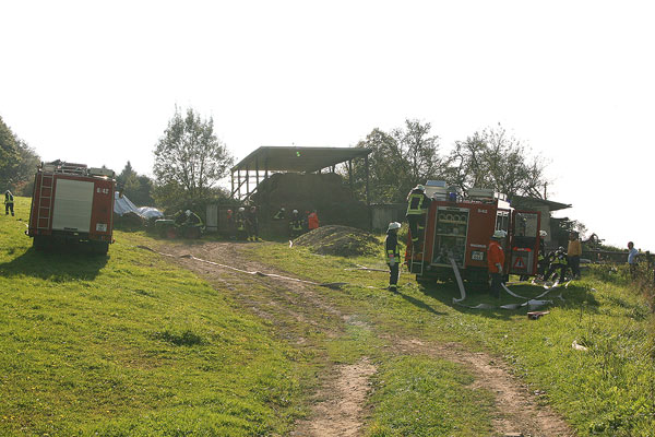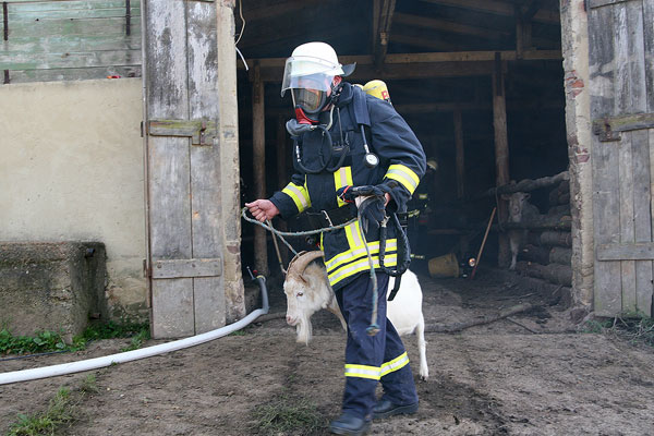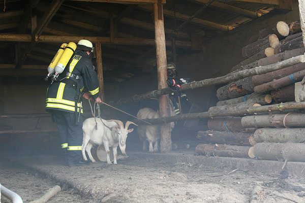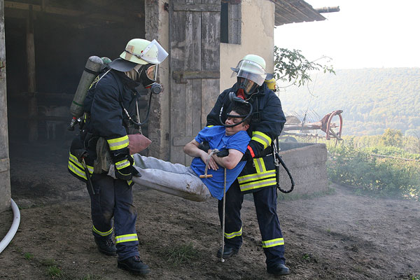 Dichter Rauch drang bereits aus der Ziegenscheune am Waldrand von Dirmingen, als die ersten Feuerwehrfahrzeuge anrückten. Dort hatten zündelnde Kinder einen Brand verursacht, so die Übungsannahme bei der gemeinsamen Übung, an der Feuerwehrleute aus drei Löschbezirken der Gemeinde Eppelborn teilnahmen. Nicht nur ein gerade mit der Heuernte beschäftigter Arbeiter war in der brennenden Scheune in der Verlängerung der Hierscheider Straße eingeschlossen, auch zwei Ziegen mussten vor Rauch und Flammen gerettet werden. Ausgerüstet mit Atemschutzgeräten drangen die ersten Trupps in das Gebäude vor, während weitere in der Zwischenzeit eingetroffenen Kräfte die Wasserversorgung aufbauten. Nachdem der Arbeiter gerettet und von einem Sanitäter der Feuerwehr medizinisch versorgt wurde, konnten auch die beiden Ziegen befreit und ins Freie geführt werden. Auch ein weiterer Arbeiter hatte sich bei seiner Flucht vor der Flammen verletzt und musste versorgt werden. Wehrführer Recktenwald war als Beobachter anwesend und war mit der Leistung der Feuerwehrleute zufrieden. In Übungen wie dieser wird regelmäßig die Zusammenarbeit der Löschbezirke innerhalb der Gemeinde trainiert.