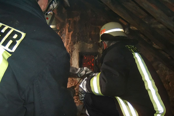 Die Wände entlang des gesamten Kaminverlaufs wurden ständig überprüft, um zu verhindern, dass sich brennbare Materialien durch die große Hitze entzündeten. Mit einem speziellen Kaminkehrgerät wurde in Zusammenarbeit mit dem Schornsteinfeger der Kaminkopf geöffnet und der Schornstein gereinigt. Mehrere Wannen mit Brandrückständen wurden durch eine Revisionsöffnung im Keller beseitigt und zum Ablöschen nach draussen verbracht.