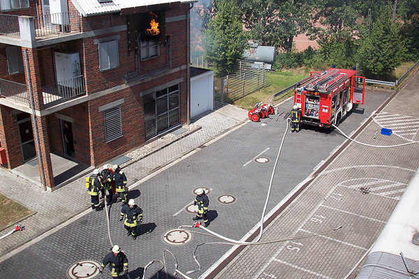 Der zweite Tag stand ganz im Zeichen von Einsatzübungen. In sieben Übungslagen wurden Kellerbrände, Küchenbrände, Zimmerbrände, Gaszählerbrände, Angriffswege über Treppenraum und über tragbare Leitern und Menschenrettung abgearbeitet. Große Hitze, Sichtweiten von nur wenigen Zentimetern und das unbekannte Gebäude kamen dabei realen Einsatzsituationen sehr nah. Immer dabei: Ausbilder der Landesfeuerwehrschule, die bei Gefahr sofort eingreifen können. Mehr als 25 Kilogramm wiegt die Schutzausrüstung eines Feuerwehrmanns, dazu musste zusätzliche Ausrüstung wie Axt und Schlauch mitgenommen werden. Beim Retten der 80 Kilogramm schweren Übungspuppen hatten viele Lehrgangsteilnehmer ihre persönlichen Leistungsgrenzen erreicht.