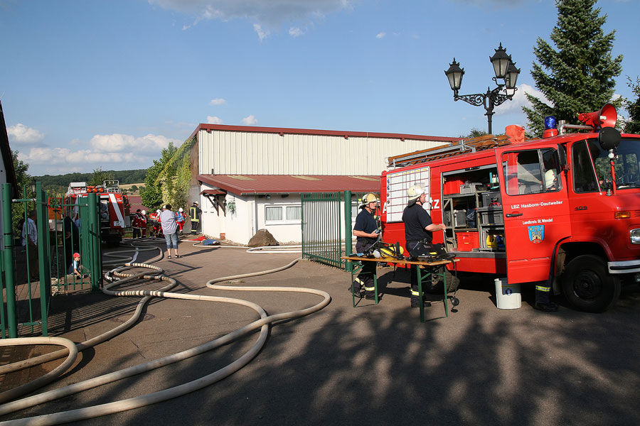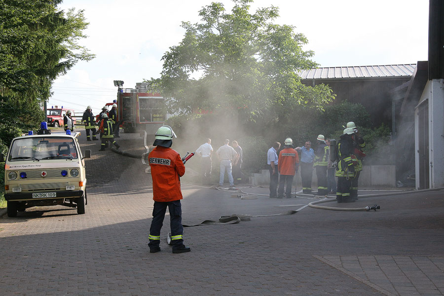 Es brennt auf dem Tannenhof in Eppelborn: Während eines heftigen Sommergewitters am Abend des 25. Juli 2008 kommt es dort durch einen technischen Defekt zu einem Schwelbrand mit starker Rauchentwicklung. Bedienstete des inzwischen als Pferdehof genutzten Anwesens entdecken den Brand frühzeitig und alarmieren über Notruf die Feuerwehr.