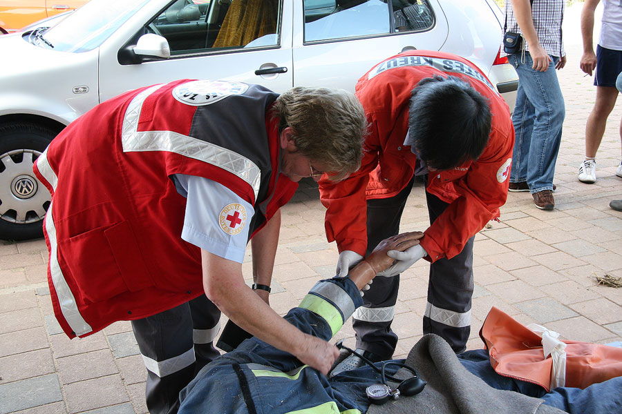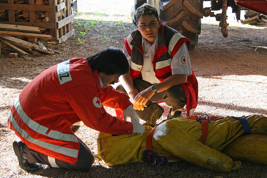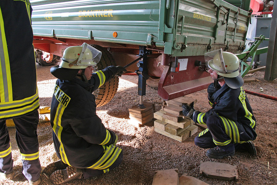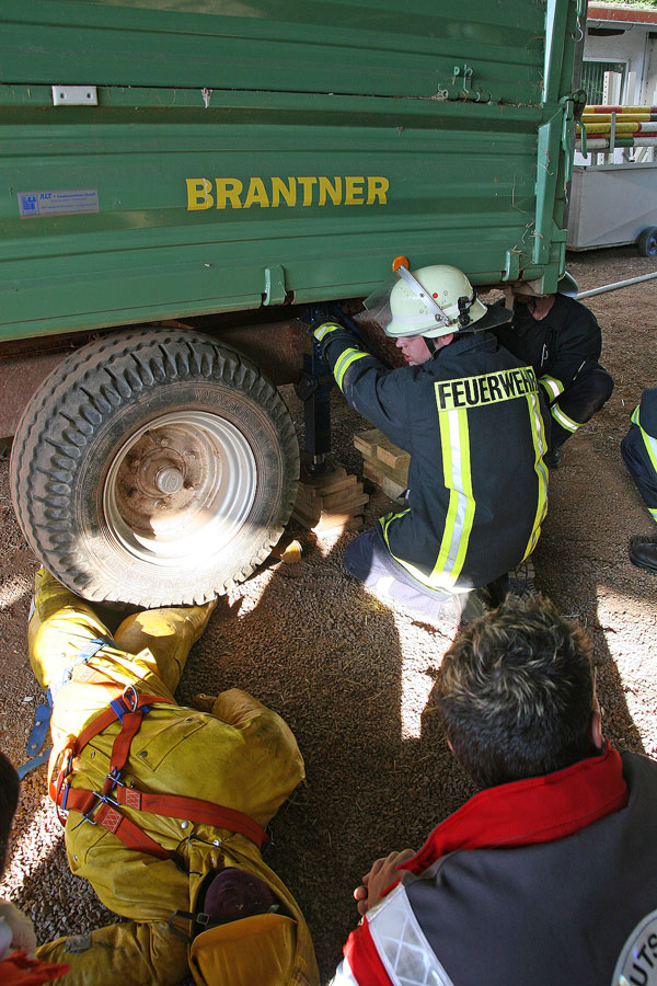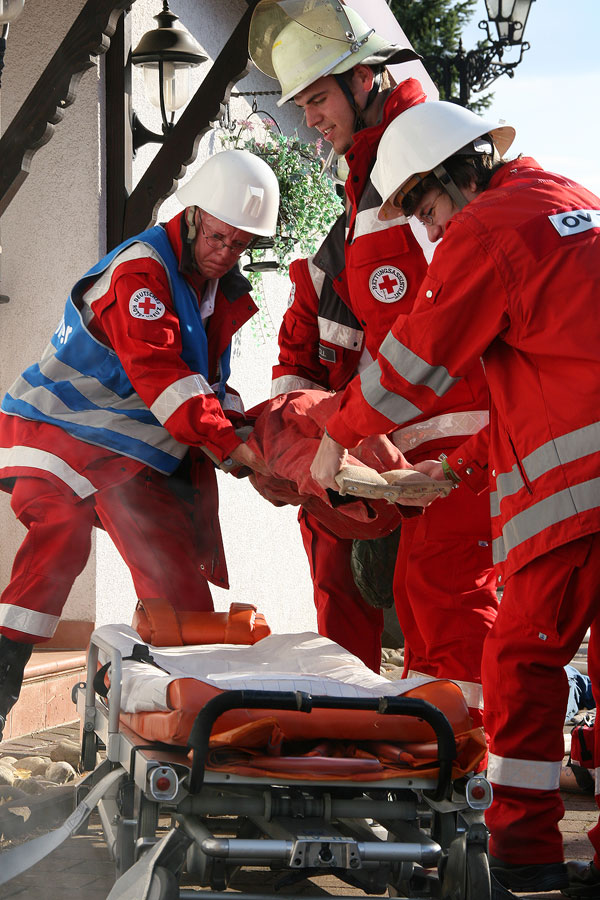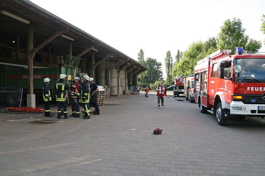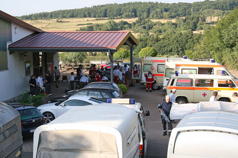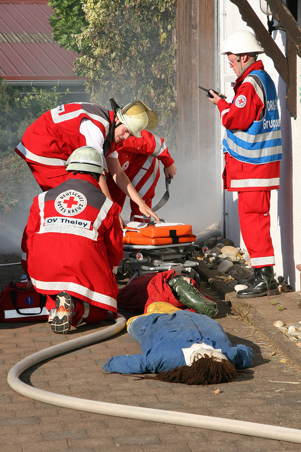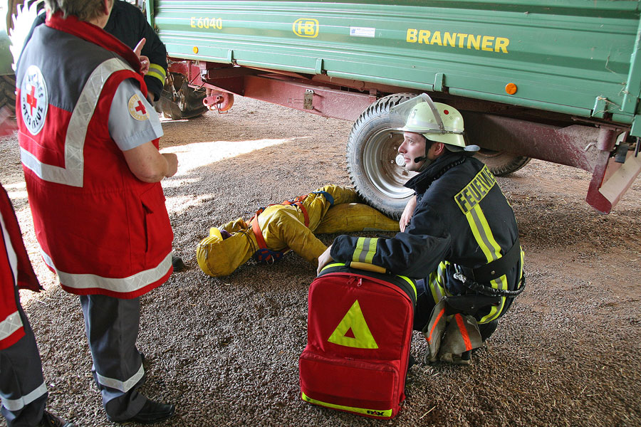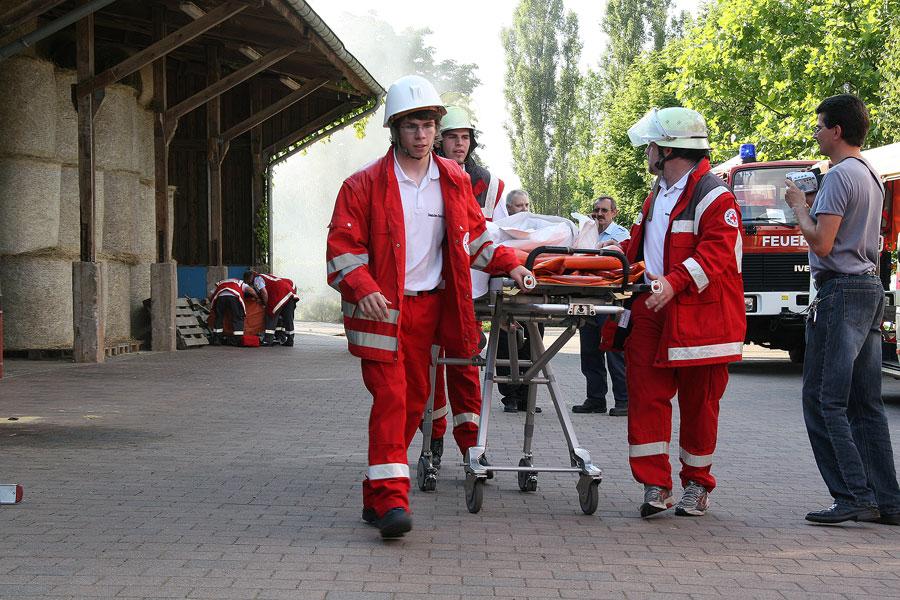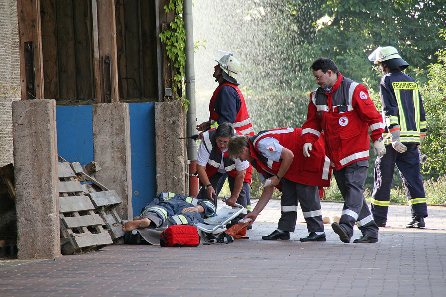 Es dauert nur 9 Minuten, dann sind die ersten gefunden. Zwei der Arbeiter sind zudem eingeklemmt und müssen erst mit technischem Gerät befreit werden,bevor sie den Sanitätern des Deutschen Roten Kreuzes aus Eppelborn und Theley übergeben werden können. Sie werden zur weiteren Versorgung zum Verbandplatz gebracht, den die Helfer des DRK zwischenzeitlich vor einer weiteren Halle eingerichtet haben.