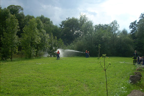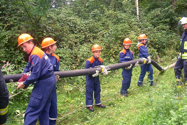 Ganz wie die Großen rückten die 27 Jungen und Mädchen aus den Jugendfeuerwehren Wiesbach und Eppelborn am 23. August 2008 gleich mit mehreren Einsatzfahrzeugen am Eppelborner Fischweiher an. Denn dort war im angrenzenden Wald ein Feuer ausgebrochen, dass sich schnell auszubreiten drohte. Natürlich war es nur ein Übungseinsatz, doch die Jugendlichen waren mit großen Eifer bei der Sache.
