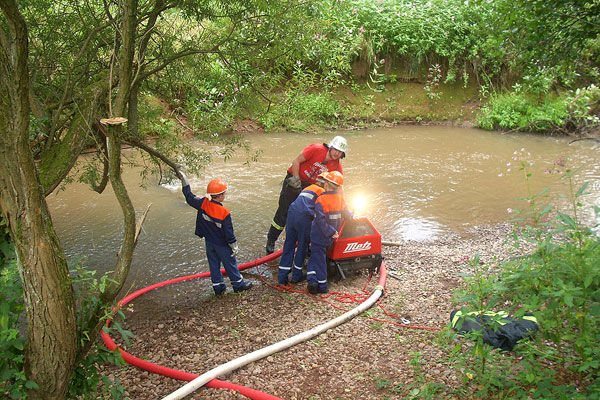 Mit tatkräftiger Unterstützung der Jugendbetreuer brachten sie mehrere große Pumpen an der Ill in Stellung und kuppelten die dicken Saugschläuche zusammen. Damit sollte das dringend benötigte Löschwasser aus dem Gewässer entnommen und durch mehrere Schlauchleitungen bis zur imaginären Einsatzstelle gepumpt werden. Mit insgesamt 7 C-Rohren und zwei Wasserwerfern konnte dann mit der Brandbekämpfung begonnen werden. "Die Aufgaben haben die Jugendlichen mit vielen Ideen und Einfallsreichtum bewältigt", so der Eppelborner Jugendbetreuer Markus Leidinger am Ende der Übung.