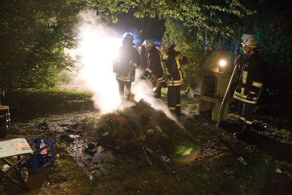 Auf der Suche nach Brennholz machten sie dabei auch vor der Grillhütte und einem erst im letzten Jahr neu errichteten Holzzaun nicht halt. Als dann auch noch Heuballen auf das Lagerfeuer geworfen wurden, hatten die Anwohner genug: Wegen der starken Rauchentwicklung riefen sie gegen 00:40 Uhr die Feuerwehr.