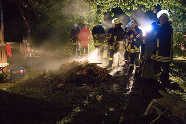 Aufgeschreckt durch das herannahende Martinshorn flüchteten die Unbekannten von der Einsatzstelle. Das Feuer konnte von den Einsatzkräften aus dem Löschbezirk schnell gelöscht werden.