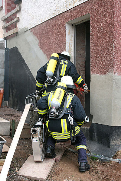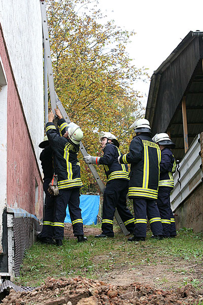 Dass ein Feuerwehrkamerad gerade sein Wohnhaus umbaute, nutzte der Löschbezirk Dirmingen am 11. Oktober 2008 für eine Angriffsübung unter Einsatzbedingungen.