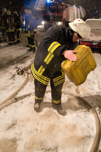 Feuerwehrleute, die auch Beschäftigte des Gemeindebauhofs sind, rückten mit einem Streufahrzeug zur Einsatzstelle aus, um die Zufahrtswege zur Einsatzstelle zu Räumen. Mit Streusalz mussten die rutschigen Zuwege zur Örtlichkeit gesichert werden.