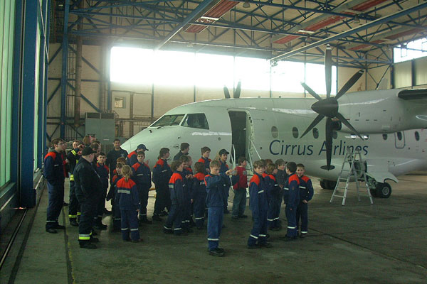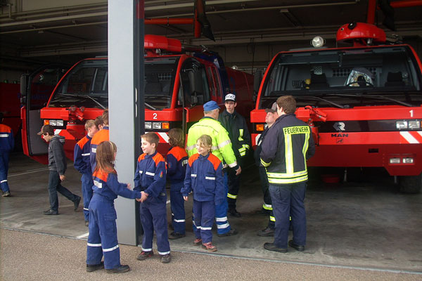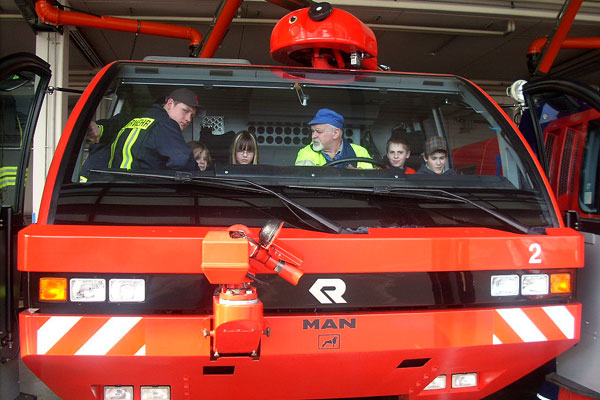 Am Samstag, den 14. März 2009 machten sich 30 Jugendfeuerwehrleute aus Eppelborn und Wiesbach zusammen mit ihren Betreuern auf den Weg zum Flughafen Saarbrücken/Ensheim, um dort die Flughafenfeuerwehr zu besichtigen. Auf Flughäfen gelten besondere Sicherheitsbestimmungen. Deshalb mussten auch die jungen Feuerwehrleute zuerst durch die Sicherheitskontrolle. Das war für viele eine ganz neue Erfahrung. Erst dann konnte es weiter zur Flughafenfeuerwehr gehen. In der Feuerwache erklärte der Leiter der Flughafenfeuerwehr die Aufgaben und Organisation der Feuerwehr und stellte die Fahrzeuge und Geräte vor. Er sprach über das Einsatzgebiet und erklärte auch, wie schnell die Flughafenfeuerwehr am Einsatzort sein muss und wie Flugzeugbrände gelöscht werden. Dann stand er den zahlreichen Fragen der Jugendlichen Rede und Antwort. Im Cockpit der großen "Panther"-Löschfahrzeuge, von denen in Saarbrücken gleich vier Stück vorgehalten werden, wurden die ganzen Hebel und Knöpfe in Augenschein genommen. Doch das besondere Erlebnis an diesem Tag war sicherlich die Vorführung, zu der es mit dem Bus über das Vorfeld des Flughafens ging. Schon die Größe der Fahrzeuge war beeindruckend, doch auch die Geschwindigkeit und die Wasserwerfer mit ihrer großen Wurfweite ließen die Besucher staunen. Weiter ging es zu einem Wartungshangar, in dem gerade mehrere Flugzeuge zur Inspektion standen. Zum Abschluss konnten die jungen Feuerwehrleute dann noch die Landung eines Airbus aus nächster Nähe erleben, bevor es nach einem gemeinsamen Gruppenfoto zur Erinnerung wieder auf den Heimweg ging.