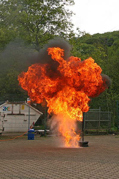 Eine gewaltige Stichflamme war zu sehen, als ein Feuerwehrmann versuchte, brennendes Fett mit Wasser zu löschen. Aber diese "Fettexplosion" war beabsichtigt und gehörte mit zu der Schulung für die Mitarbeiter der in Eppelborn ansässigen Firma Juchem. An insgesamt vier Terminen wurden rund einhundert Mitarbeiter aus allen Produktions- und Verwaltungsbereichen über das richtige Verhalten im Brandfall und die effektive Brandvermeidung geschult. Zu Beginn lernten die Teilnehmer von Löschbezirksführer Felix Becker und Brandschutzingenieur Eric Holzer wissenswertes über mögliche Brandursachen in Betrieb und Haushalt. Ergänzend dazu wurde über vorbeugende Maßnahmen zur Vermeidung von Bränden sowie das richtige Verhalten für den Fall, dass es doch zu einem Feuer gekommen ist informiert. Auf dem Parkplatz hatten weitere Helfer zwischenzeitlich ein Feuer vorbereitet, an dem jeder einmal die Anwendung eines Feuerlöschers ausprobieren konnte. Erfahrene Feuerwehrleute zeigten den Teilnehmern dabei, wie man einen Feuerlöscher vorbereitet und auf welche Dinge man bei der Verwendung achten muss. Wie wichtig dieses Training für die Mitarbeiter ist zeigt die steigende Zahl von Bränden in Industrie und Gewerbe. Kann man ein Schadenfeuer verhindern, oder einen Entstehungsbrand schnell löschen, können größere Schäden für das Unternehmen vermieden werden. In den aktuellen Krisenzeiten ist dieser Aspekt der Arbeitsplatzsicherung nicht zu vernachlässigen.