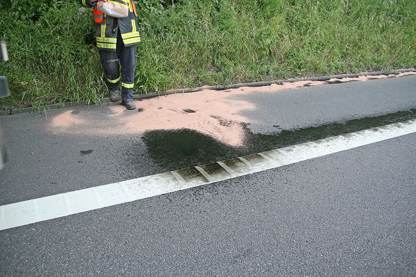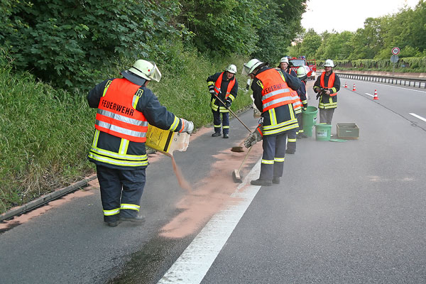 Mit Ölbindemittel streuten die Einsatzkräfte die rund 50 Meter lange, rutschige Gefahrenstelle ab und nahmen das ausgelaufene Motoröl auf. Der Lastzug war durch den Schaden nicht mehr fahrbereit und musste von einem Spezialunternehmen von der Autobahn geschleppt werden.